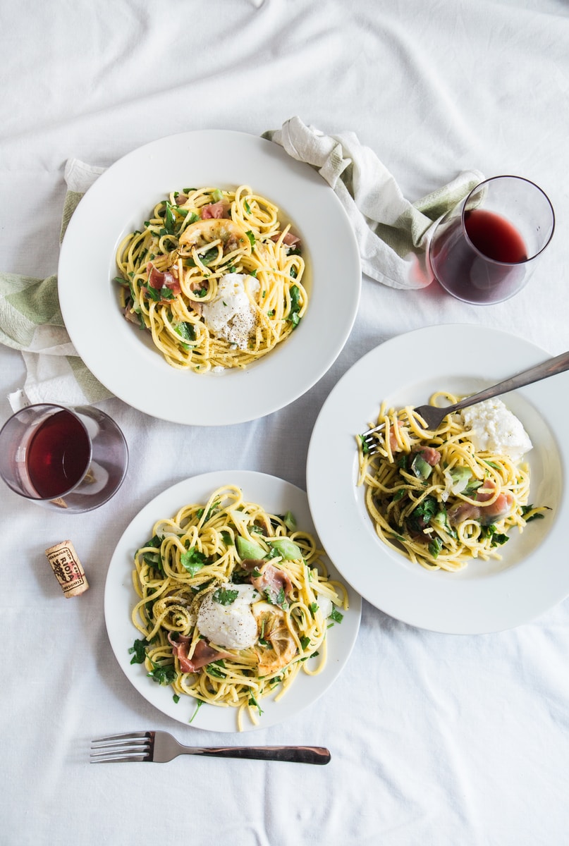 three round white plates with pasta near two glass cuups